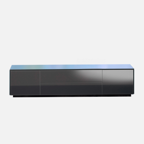 Mit einer flachen, horizontalen Form, die durch klare Linien und eine symmetrische Anordnung der Fronten überzeugt. Diese bieten praktische Schubladen und Fächer für großzügigen Stauraum und machen das Möbelstück zu einer idealen Lösung für Wohn- oder Multimedia-Bereiche.